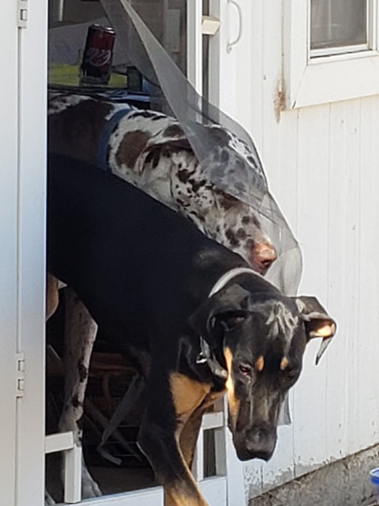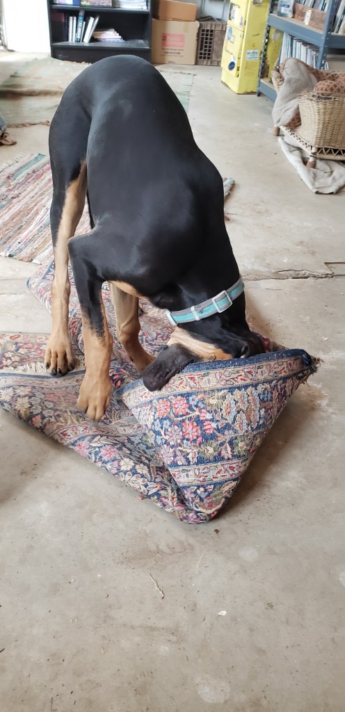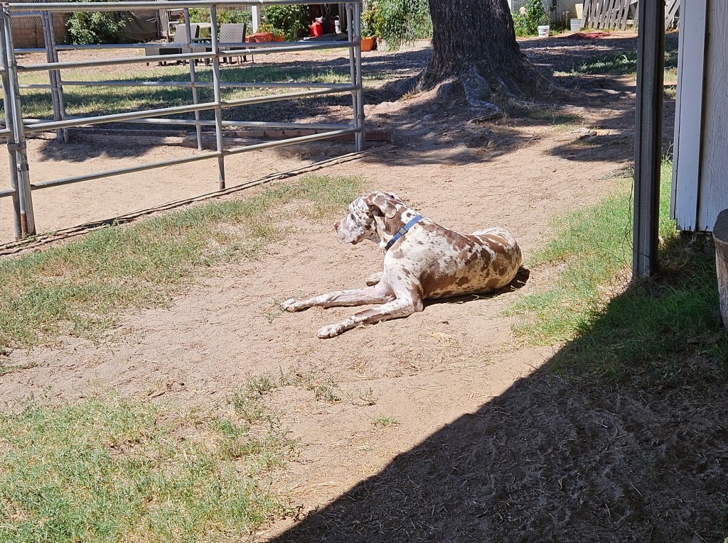 All of the horses’ grain and hay was stored in a barn in the field. One night Topps figured out how to get into the barn. In the morning we discovered him locked inside, with every grain bag ripped open, and scattered around.