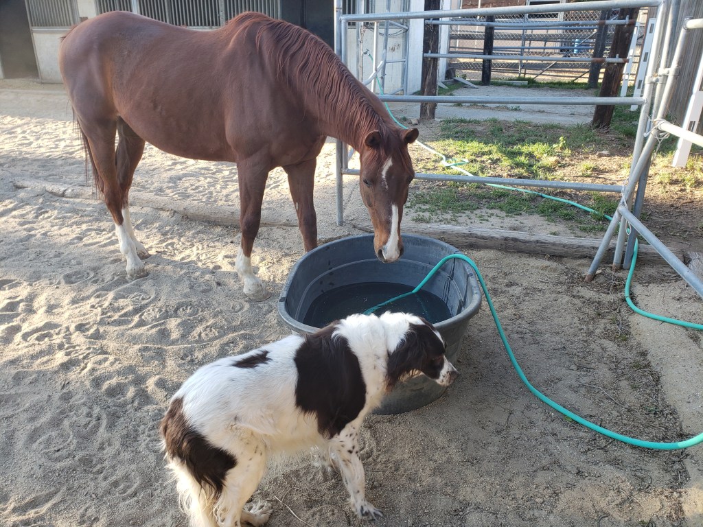 Topps spent weeks with each front foot in a separate bucket filled with ice water. I left him loose while I sat nearby cleaning tack. Usually he fell asleep. When he could walk a little bit, we hobbled to a nearby stream and he stood patiently in it for hours.